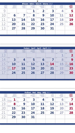 Kalendář nástěnný 2017 - 3měsíční/modrý skládaný s jmenným kalendáriem (czeski)