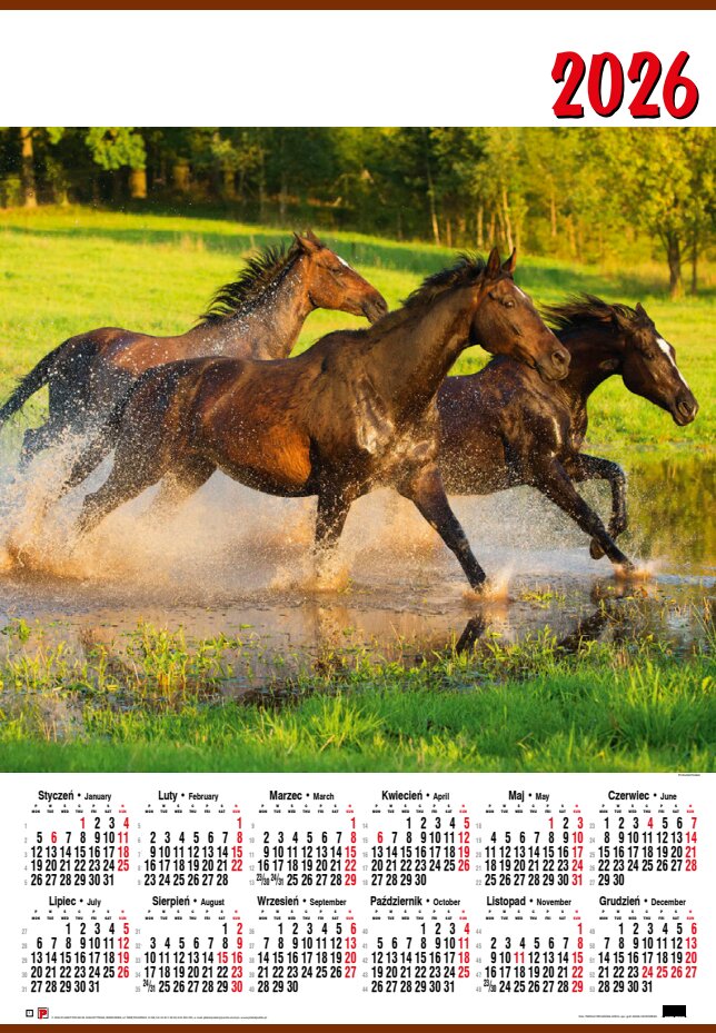 Kalendarz ścienny jednoplanszowy B1 nr 1 Konie 2026 darmowa wysyłka od 30szt (poniżej tej ilości wysyłka na koszt klienta) dopuszczalne mieszanie wzorów