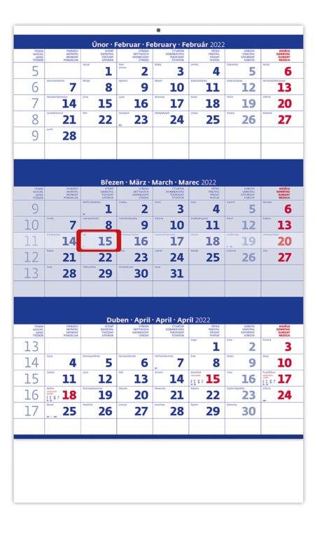 Kalendář nástěnný 2022 - Tříměsíční modrý (czeski)