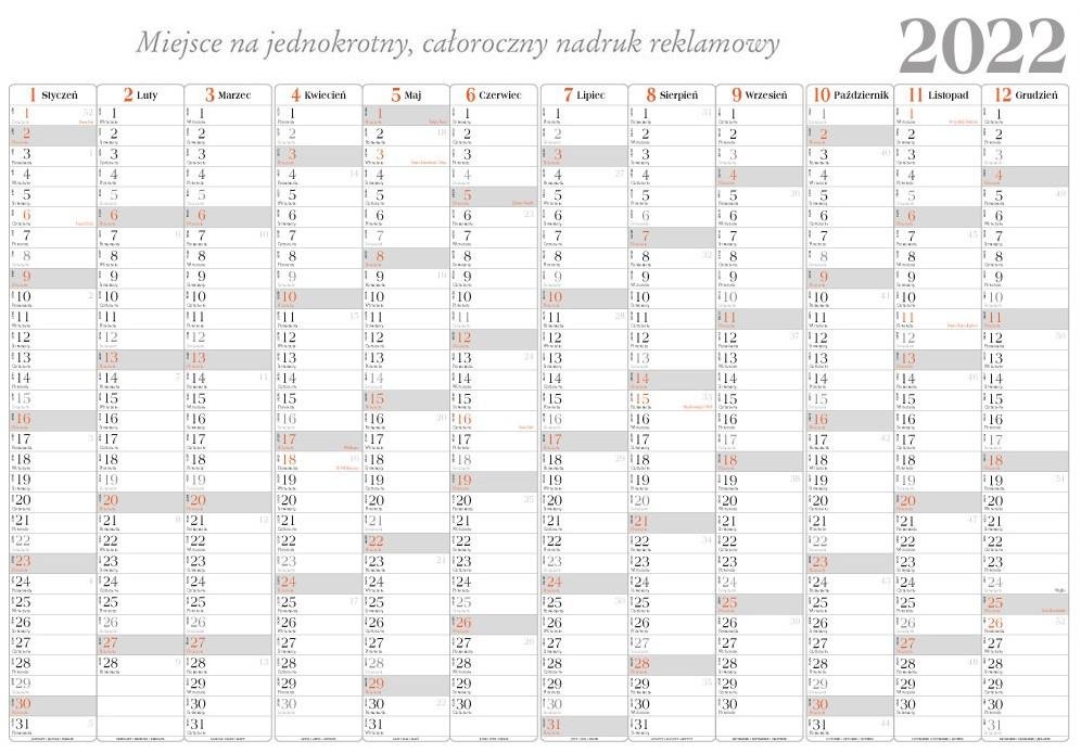 Specyfikacja format kalendarza:98 x 68 cm; pole pod nadruk:79 x 7 cm; kalendarium:PL, EN, DE, RU; papier:karton 230 g/m przeczytaj całość