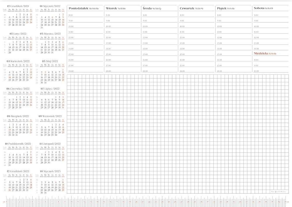 Specyfikacja:- format kalendarza:45 x 32 cm;- kalendarium:PL, EN, DE;- papier:offsetowy 120 g/m;- introligatorka:blok klejony; przeczytaj całość