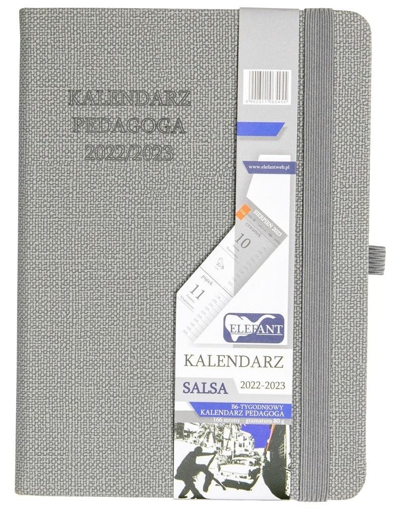 Kalendarz 2022/23 B6 tyg. Salsa szary ELEFANTFormat B6 - tygodniowywymiar: 176x125 mmpapier: delikatne chamois 80 g/m2ilość stron: 166+ zaokrąglone narożniki opraw i stron+ gumka spinająca kalendarz+ elastyczny uchwyt na długopis+ dwie tasiemki w kolorze okładki+ koperta na odwrocie okładki+...