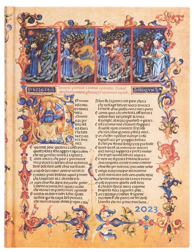 Kalendarz 2023 ekskluzywnej marki Paperblanks. Format ultra typu vertical - cały tydzień rozplanowany jest na 2 stronach z podziałką godzinową. Kalendarium w języku angielskim. W środku miejsce na notatki, roczny planer, oznaczone wybrane święta międzynarodowe, mini kalendarium, międzynarodowe...