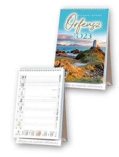format kalendarza 29,5 x 13 cm;kalendarz stojący poziomy z odwracanymi kartami;kalendarium: 28 kart; 1 tydzień na stronie; bieżąca numeracja dni i tygodni; imieniny; pola na notatki; fazyKsiężyca; znaki Zodiaku; święta państwowe i kościelne oraz dni świąteczne pracujące; skróconeformat kalendarza...