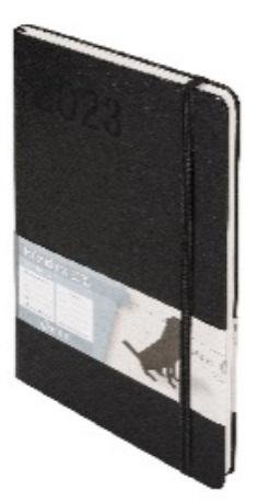 format: A5, wymiary okładki: 210x145 mm, układ: tydzień na stronie, ilość stron: 352, oprawa: twarda, materiał: skóra ekologiczna, gramatura papieru: 80g, kolor papieru: off white, dodatki: plan roku 2023, ważne wydarzenia, skorowidz adresowy, notatki, pionowa gumka zamykająca w kolorze okładki, wstążka w kolorze okładki, gumka na długopis: w kolorze okładki, zaokrąglone rogi, wyklejka kremowa, koperta