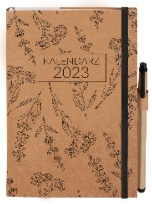 format: A5, wymiary okładki: 211x143 mm, układ: tydzień na stronie, ilość stron: 144, oprawa: miękka, materiał: papier, gramatura papieru: 80g, kolor papieru: chamoise, dodatki: plan roku 2023, ważne wydarzenia, skorowidz adresowy, notatki, pionowa gumka zamykająca: grafitowa, wstążka: grafitowa, długopis z gumką w zestawie, wyklejka: chamoise
