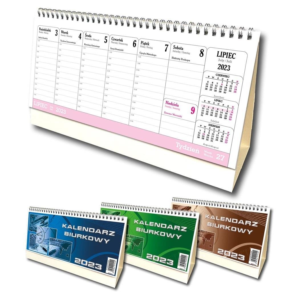 Miks wzorów, towar wysyłany losowo. Cena za sztukę.Kalendarz biurkowy 2023:poziomy,układ: tygodniowy z podglądem miesięcznym,numeracja tygodni,imieniny,nazwy miesięcy i dni tygodnia w języku polskim, angielskim, niemieckim,spirala srebrna,idealny do biura i dla firm,wymiary: 29,5 x 16,5 cm. przeczytaj całość