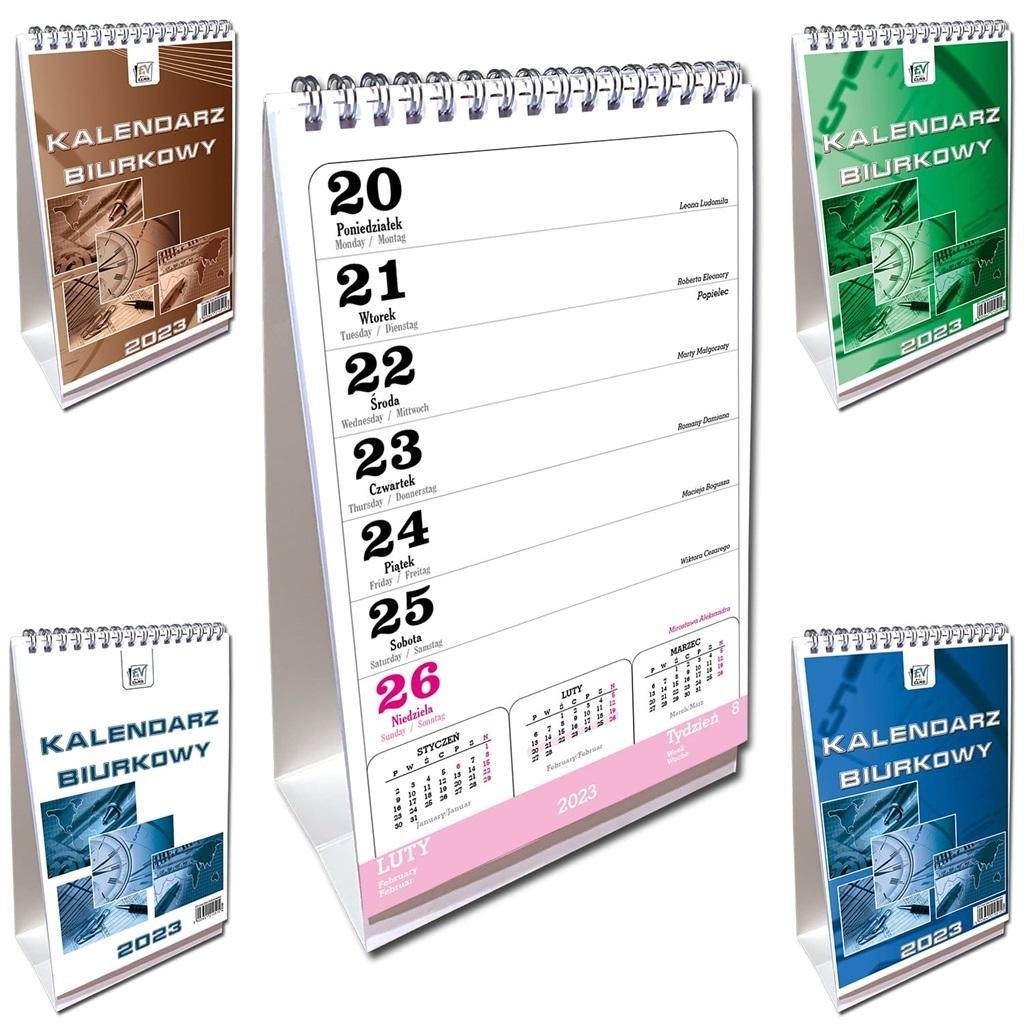 Miks wzorów, towar wysyłany losowo. Cena za sztukę.Kalendarz biurkowy 2023:pionowy,układ: tygodniowy z podglądem miesięcznym,wewnątrz imieniny, nazwy miesięcy w języku polskim, angielskim, niemieckim,spirala srebrna,doskonały do biura i dla firm,wymiary: 27,6 x 14,9 cm,kalendarz występuje w kilku... przeczytaj całość