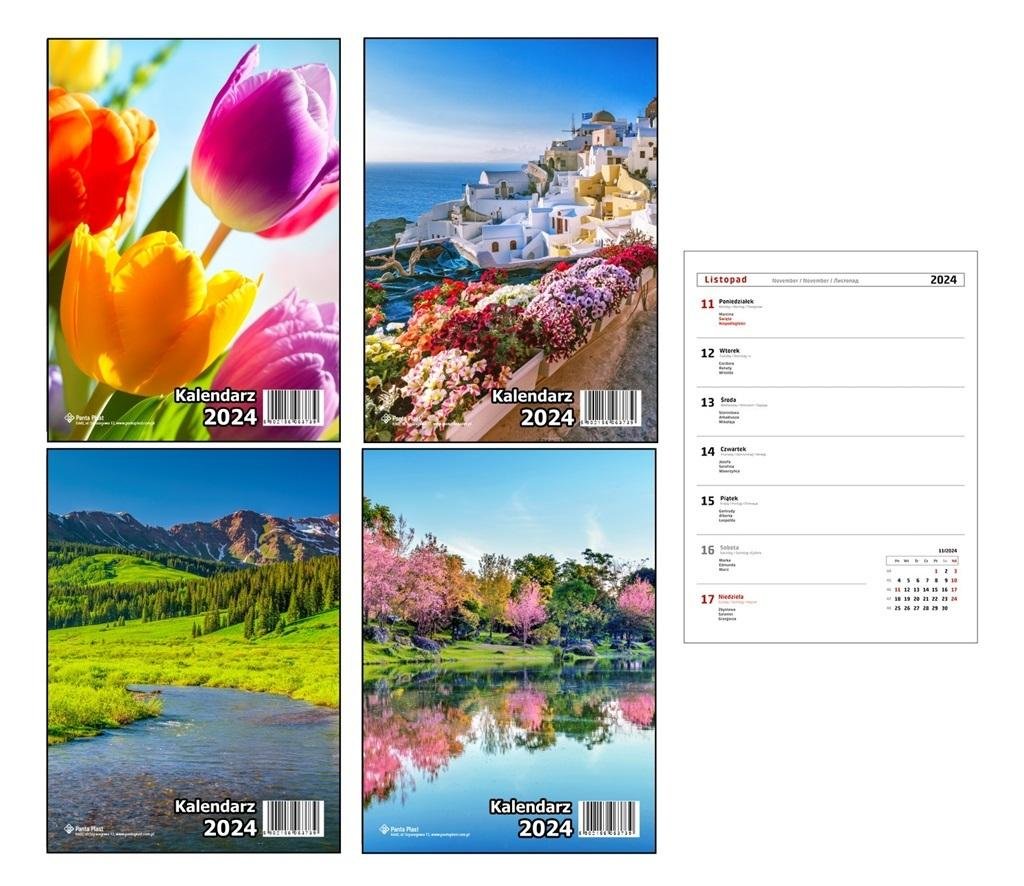 Miks wzorów, towar wysyłany lodowo. Cena za sztukę.Papier - środek 70g/m2; okładka kreda błysk 90 g/m2, Kalendarium - jeden tydzień na jednej stronie, w dolnym rogu skrócony kalendarzyk miesiąca, spirala biała, podstawka o profilu trójkątnym, karton 350g/m2, jednostronnie bielony zapewnia...