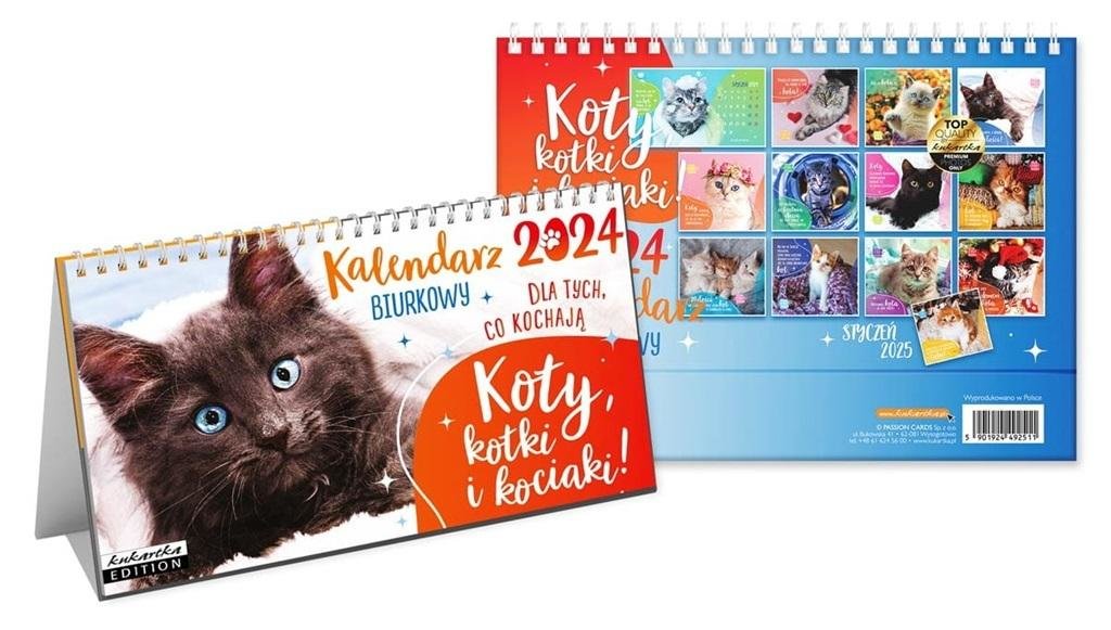 Kalendarz na biurko rok 2024 z serii "Koty, kotki, kociaki" Każdy miesiąc cieszy pięknym zdjęciem kotka i inspirującym cytatem, które będzie wspaniałą ozdobą Waszego domu lub biura. Taki kalendarz to idealny prezent dla miłośników kotów Kalendarz ma wymiary 21x12 cm Dodatkowe kalendarium na odwrocie z miejscem na notatki Styl: cytaty, nowoczesny, klasyczny, zdjęciowy PREZENT: dodatkowy 13 miesiąc - Styczeń 2025
