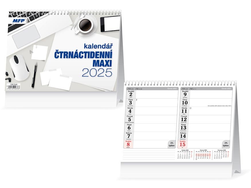 Stolní kalendář na rok 2025 s názvem Čtrnáctidenní MAXI. Vhodný pro zapisování důležitých poznámek, k organizování různých událostí každodenního života. Možnost dotisku firemního loga a textu na spodní stranu kalendáře. przeczytaj całość