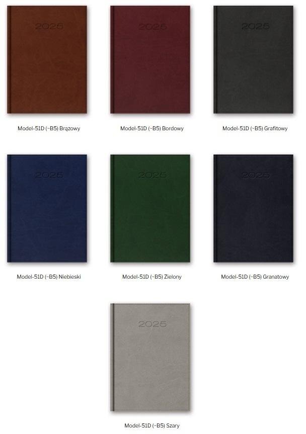 Kalendarz w układzie dziennym (1 dzień na stronie). Format B5 (blok: 17,2 x 24 cm), papier kremowy, druk szaro-bordowy, registry drukowane. Wstążka-zakładka; 336 stron; perforacja narożna; notes teleadresowy. Okleina skóropodobna. Typ okładki: standard. przeczytaj całość