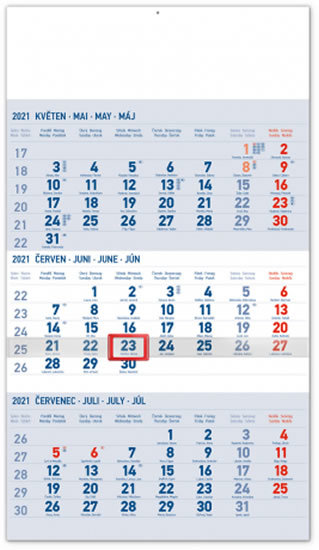 Profesionální plánovací kalendář s náhledem tří měsíců současně. Obsahuje české, slovenské, německé a britské kalendárium s českými jmény na světlemodrém pozadí przeczytaj całość