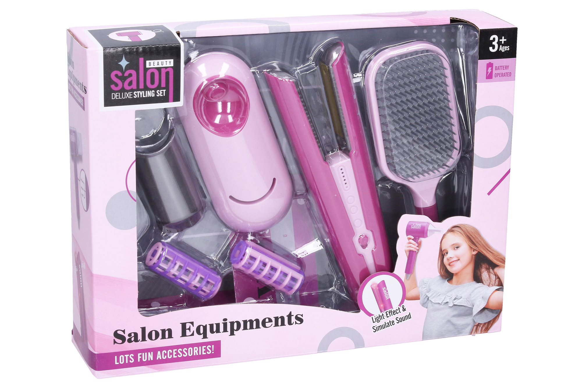 Žehlička na vlasy. Velikost žehličky 19cm. Obsahuje: kulmu, kartáč na vlasy, natáčky, stojánek na kulmu. Zvukové a světlené efekty. 2xAAA baterie nejsou součástí. przeczytaj całość