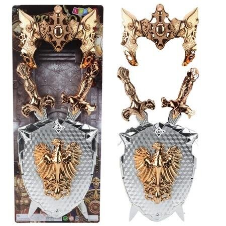 ZESTAW RYCERSKI DLA DZIECI TARCZA Z DWOMA MIECZAMI MASKA Zestaw rycerski dla dzieci to idealna propozycja dla małych fanów przygód, średniowiecznych legend i zabaw w dzielnych wojowników. W zestawie znajdują się dwa imponujące miecze, ozdobna tarcza z motywem złotego orła oraz maska. Zestaw...