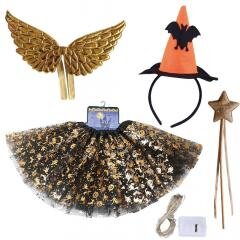 Strój czarownicy na Halloween W zestawie tiulowa spódniczka (długość 30 cm), opaska - kapelusik, różdżka, skrzydełka, ledowe światełka. Wymiary: 49,5x2x52cm przeczytaj całość