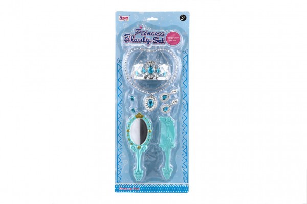 Sada krásy plast korunka, náhrdelník, naušnice, prsten 2ks, zrcátko, hřeben na kartě 22x54cm