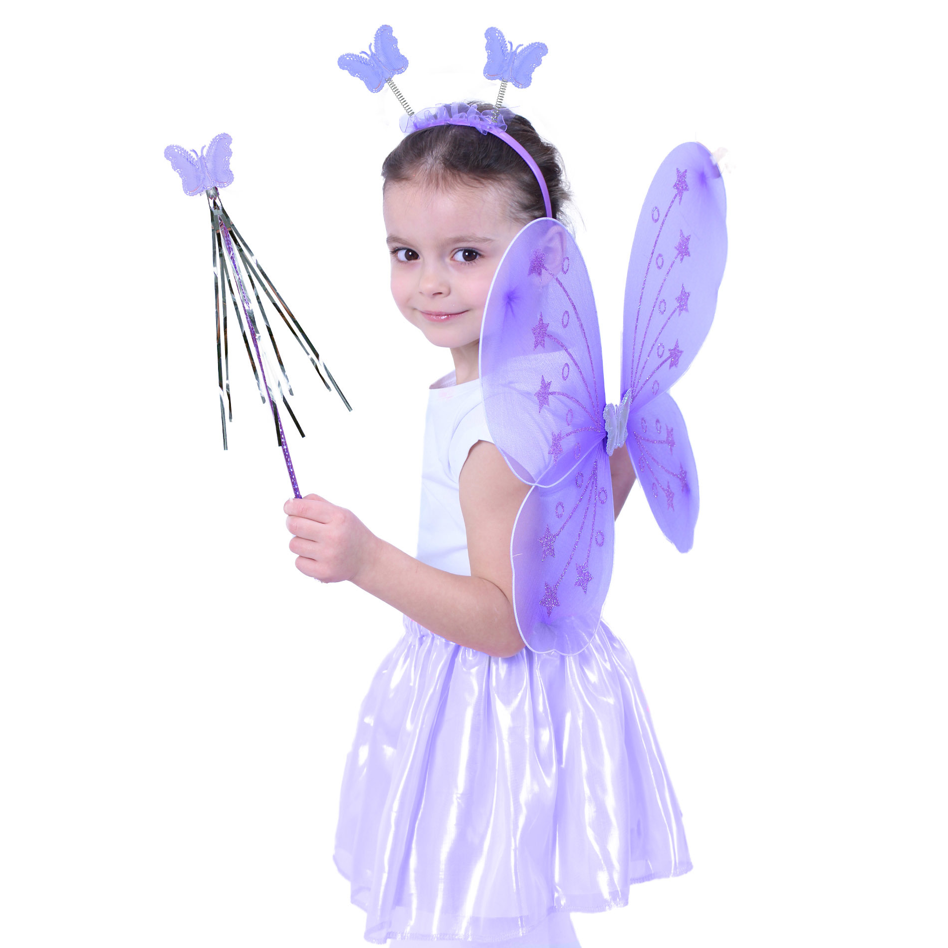 Urocze fioletowe skrzydła motyla na gumce przeznaczone są dla dziewczynek w wieku od 3 do 10 lat (104-150 cm). W skład tego karnawałowego zestawu wchodzi również opaska z motylkami na sprężynkach oraz różdżka. przeczytaj całość