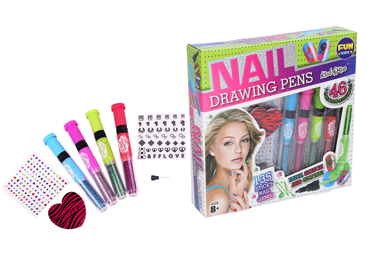 Nehtový set. Balení obsahuje lakovací pera na nehty, flitry, kamínky, nálepky. przeczytaj całość