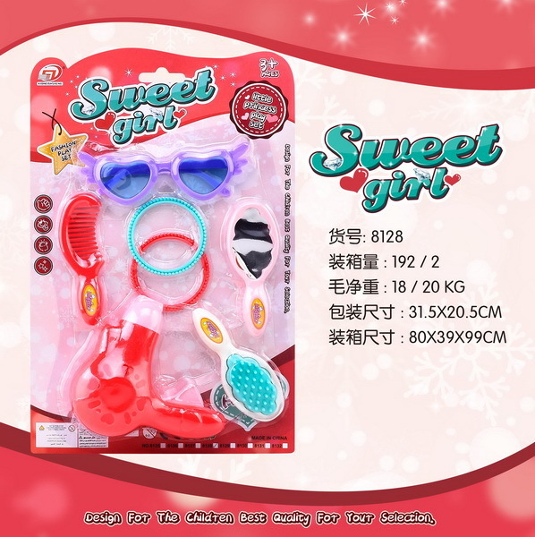 Kosmetický set. Součástí brýle, hřeben, kartáč, zrcátko, fén, 2 náramky. przeczytaj całość