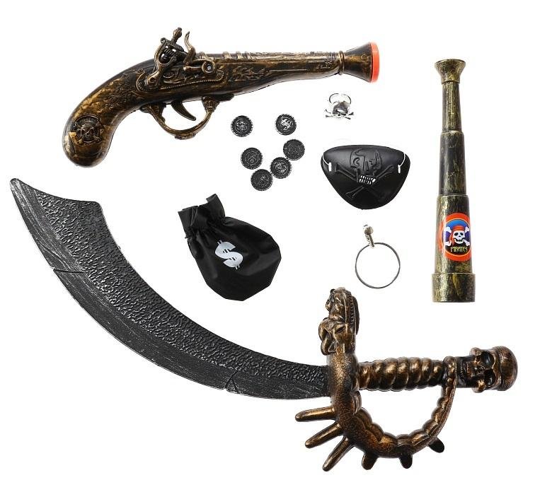 ZESTAW DZIELNY PIRAT (Z LUNETĄ) W skład zestawu wchodzą: szabla, pistolet, luneta, opaska na oczy, srebrny pierścionek z czaszką, duży okrągły kolczyk, worek monet Długość szabli: 47 cm Długość pistoletu: 29 cm Długość lunety: 10 cm Materiał: plastik przeczytaj całość