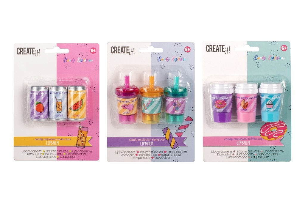 Balzám na rty voňavý Candy 3 ks – tři různá barevná provedení plechovka, kelímek s brčkem a kelímek s víčkem a tři různé příchutě. przeczytaj całość
