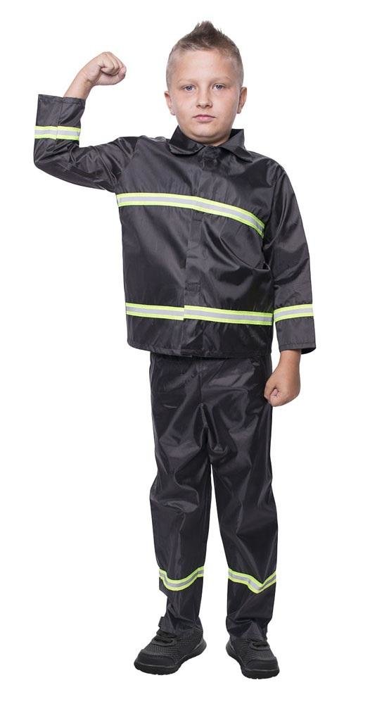 Przebranie dla dziecka - strażak. W skład zestawu wchodzi bluza z długimi rękawami oraz spodnie. Strój w kolorze czarnym. Z tyłu posiada napis ""STRAŻ"". Przebranie na bal przebierańców, halloween, zabawy tematyczne, zabawy w przedszkolu i szkole. Strój w rozmiarze L na wzrost 130 cm - 140 cm przeczytaj całość