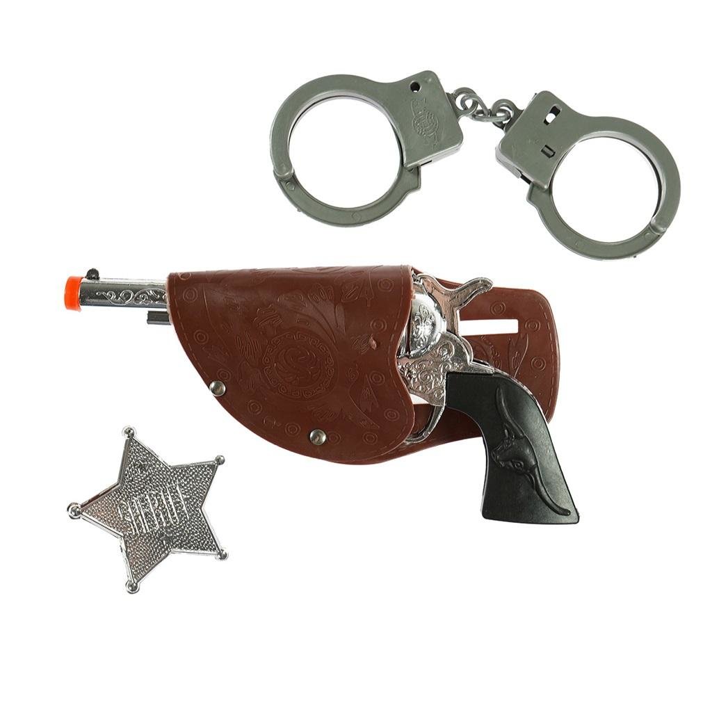 Zestaw akcesoriów szeryfa. W skład zestawu wchodzi pistolet w kaburze, przypinka w kształcie odznaki oraz kajdanki. Kajdanki nie wymagają użycia kluczyka, są bezpieczne podczas zabawy. Zestaw wykonany z tworzywa sztucznego. Doskonały dodatek do stroju policjanta, szeryfa lub jako samodzielne... przeczytaj całość