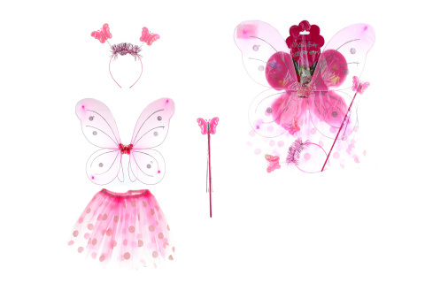 - Zestaw zawiera: skrzydła, spódniczkę w groszki, różdżkę i opaskę z motylkami