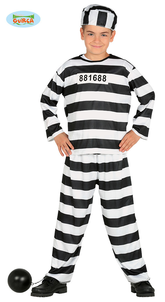 Dziecięcy kostium więźnia składa się z dwuczęściowego stroju, typowego dla mundurów więziennych. Strój ma czarno-białe paski i jest skrojony tak, by wiernie odwzorowywać prawdziwy strój więźnia. Na przedniej części znajduje się numer przypominający identyfikator więźnia.