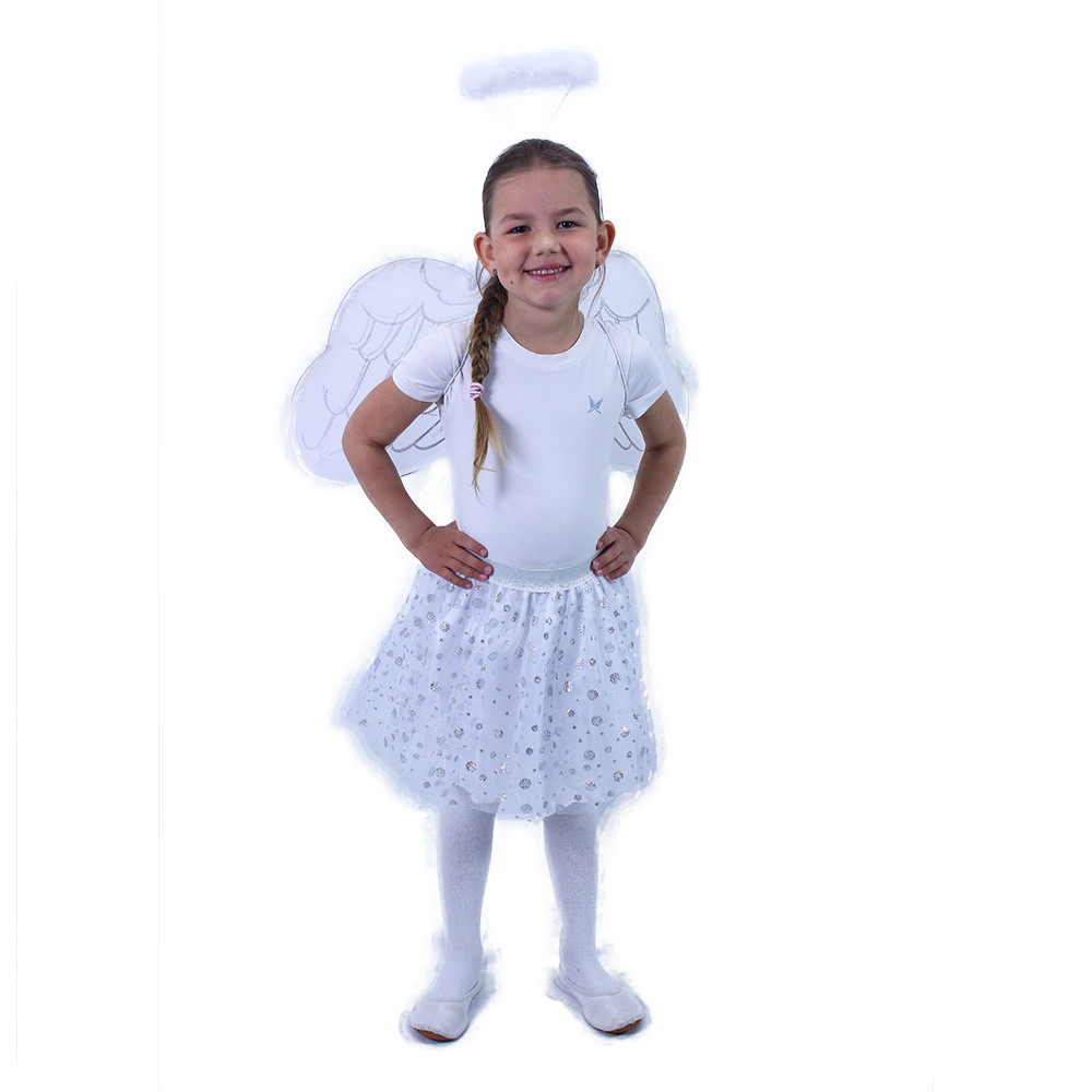 Krásná andělská sada pro malé holčičky! Sada obsahuje bílá křídla, TUTU sukýnku se stříbrným dekorem a čelenku. Sukýnka je v pase na gumu. przeczytaj całość