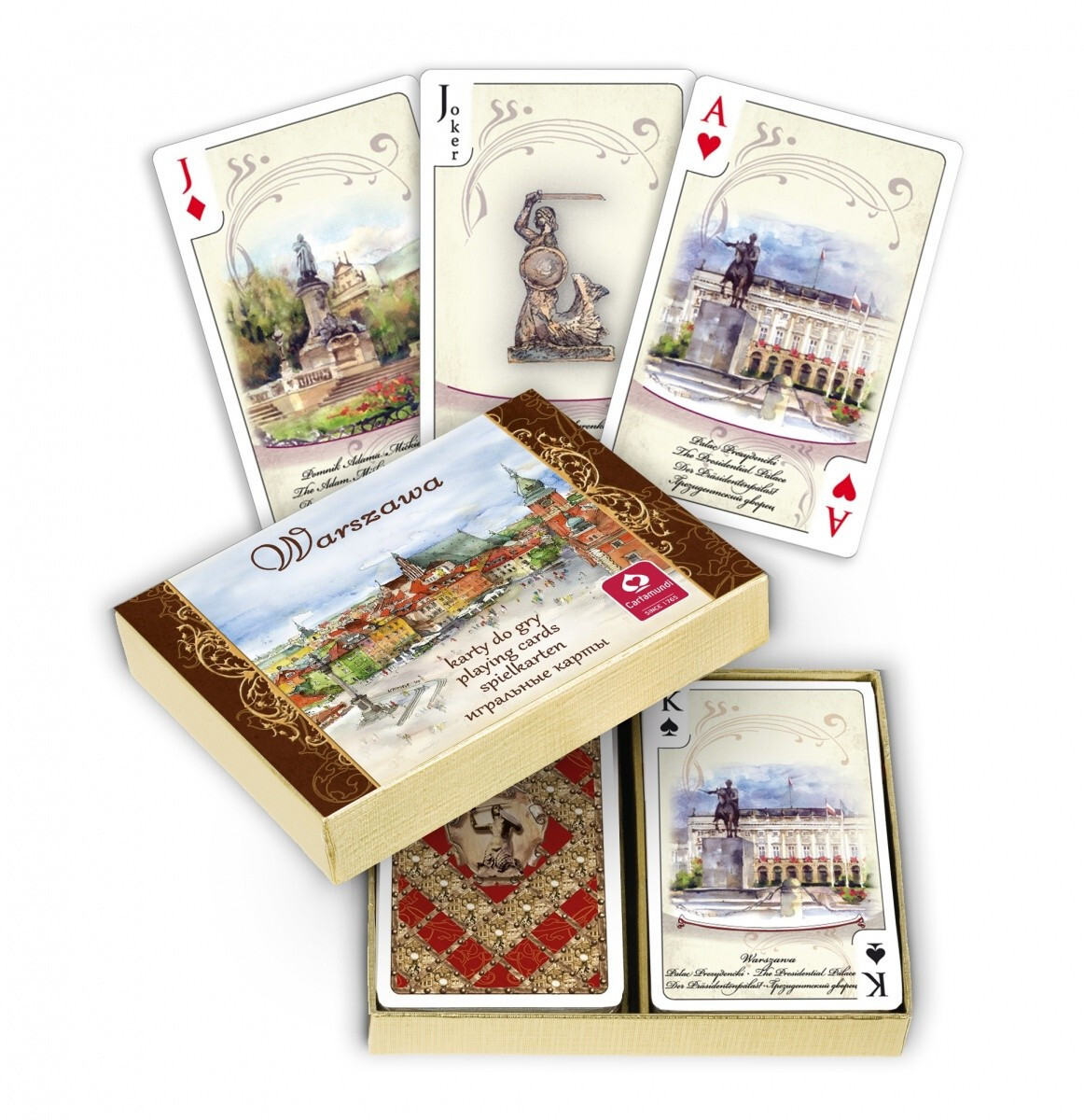 Akwarele - Warszawa 2 x 55 listkówKomplet dwóch talii 55 listków zapakowane w eleganckie pudełko, doskonały pomysł na prezent, souvenir z Warszawy. Na awersach widnieją obrazy historycznych budowli warszawskich, najbardziej atrakcyjnych miejsc, które warto zobaczyć.Talia liczy 55 kart do gry w... przeczytaj całość