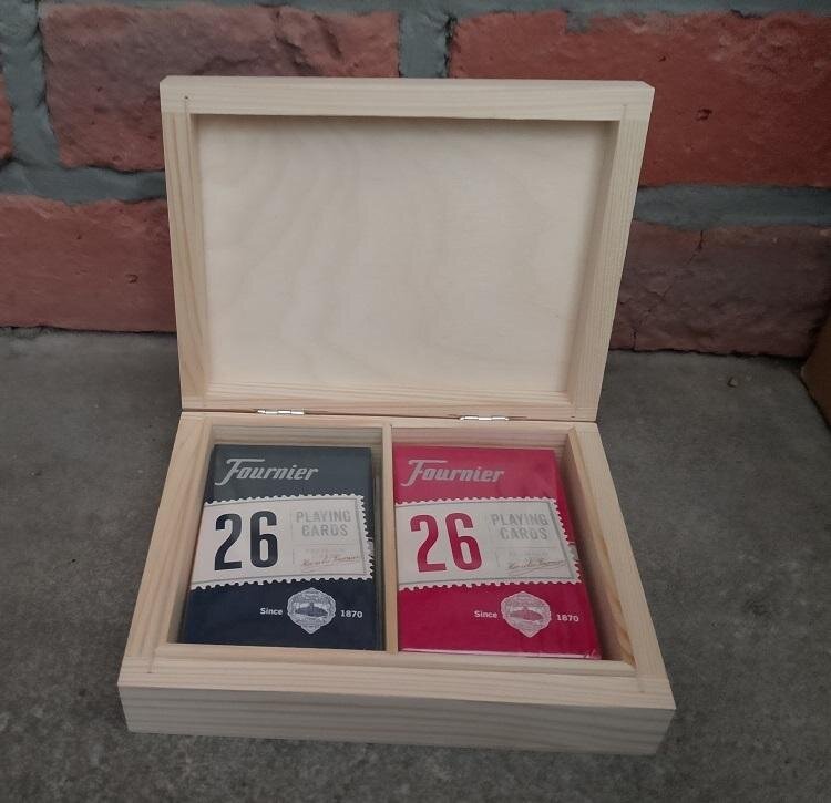 Komplet dwóch talii kart Fournier No 26 w drewnianej szkatułce.Marka istniejąca na rynku od 1868 roku.Karty w rozmiarze brydżowym (56mm x 89mm) z rewersem czerwonym i niebieskim.Karciarka wykonana z drewna lipowego.Idealny prezent dla każdego miłośnika Brydża.Made in Spain.Karty Fourniera...