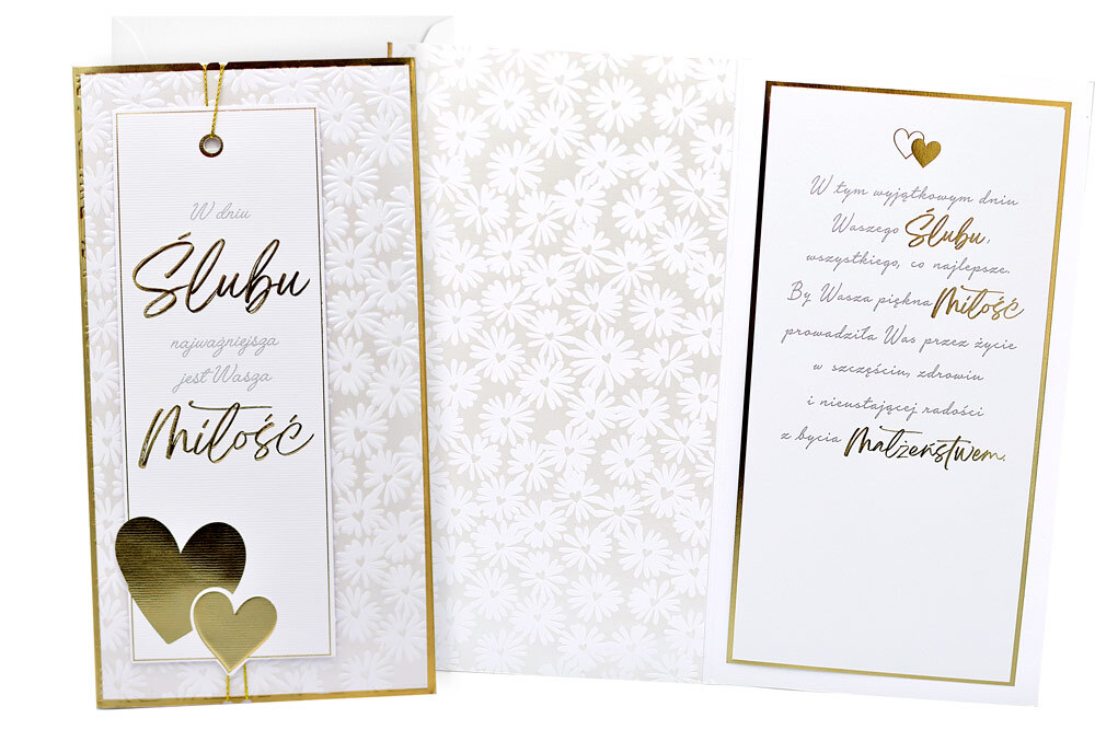 Kartka z okazji Ślubu z serii Passion Moments PM-423Każda kartka w kolekcji Passion Moments to małe arcydzieło - wyjątkowe i niepowtarzalne, piękne wizualnie. Kartki PM są bardzo bogato zdobione, a jednocześnie skromne i stylowe, cały efekt tkwi w detalach i doskonałym wykonaniu. W zależności od...