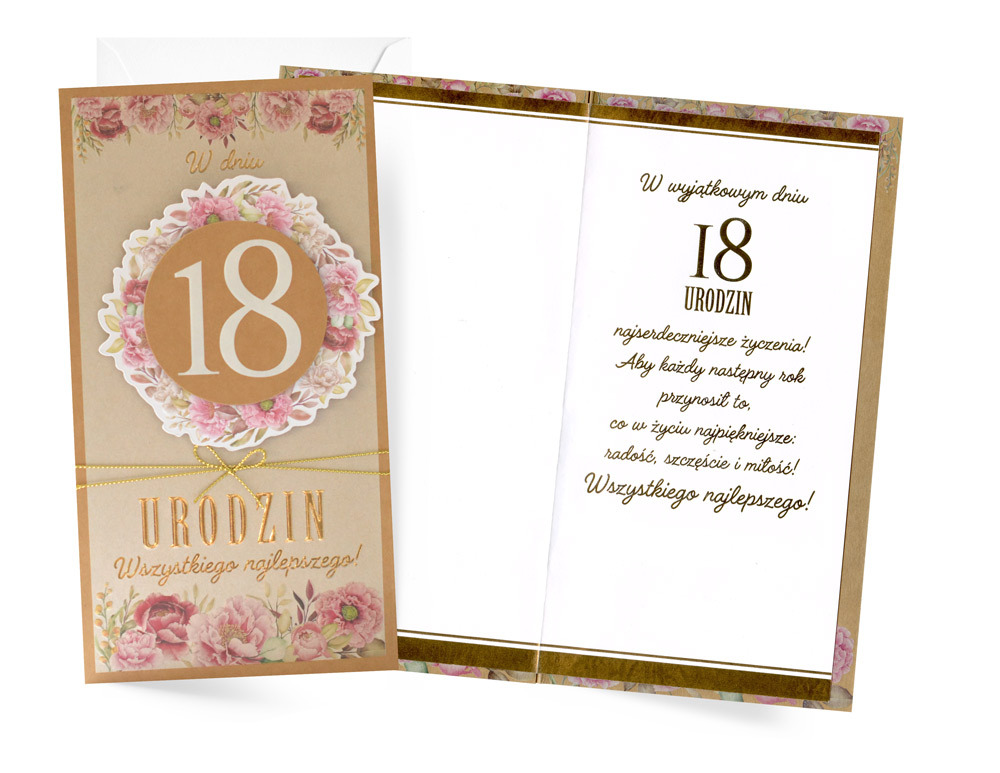Kartka "W dniu 18 urodzin" z serii Passion Moments PM-413Każda kartka w kolekcji Passion Moments to małe arcydzieło - wyjątkowe i niepowtarzalne, piękne wizualnie. Kartki PM są bardzo bogato zdobione, a jednocześnie skromne i stylowe, cały efekt tkwi w detalach i doskonałym wykonaniu. W...