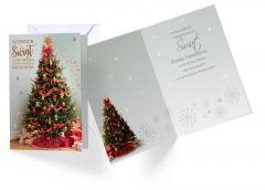 Kartka wielkości B6, zdobiona w zależności od wzoru metaliczną folią lub brokatem. Każda kartka posiada kolorowe życzenia w środku i koperte.Wymiary karnetu po złożeniu: 11,7 x 16,6 cm. przeczytaj całość