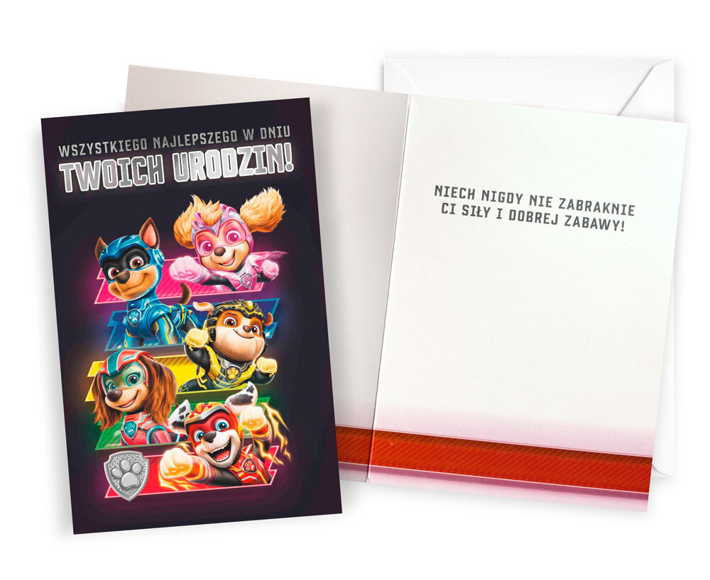 Kartka na urodziny DHS-043 z serii Psi PatrolKartka z wyjątkowymi życzeniami w środku, zdobiona metaliczną folią, kolorowa w środku i na zewnątrz, z białą kopertą w zestawie.Specyfikacja:Wielkość kartki: 11,0 x 17,0 cmkoperta: biała w zestawieokazja: urodziny przeczytaj całość