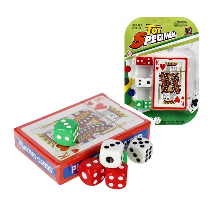 Kostky a karty, obsah sady je 6 kostek ve třech barvách a hrací karty. Rozměry balení jsou 13x19x2cm. Určeno pro děti ve věku: 3+. przeczytaj całość