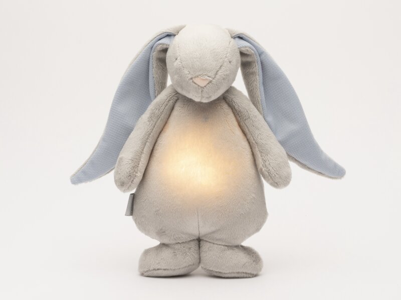 Brzuszek zajączka świeci i pełni funkcję nocnej lampki z wyborem siedmiu kolorów świecenia. Delikatne światło pomaga dziecku czuć się w łóżeczku bezpiecznie. Światło można włączyć także bez dźwięków. Przy włączonej funkcji Shake światło uruchamia się potrząśnięciem zabawki. Zajączek podczas świecenia nie nagrzewa się i jest całkowicie bezpieczny dla dziecka.