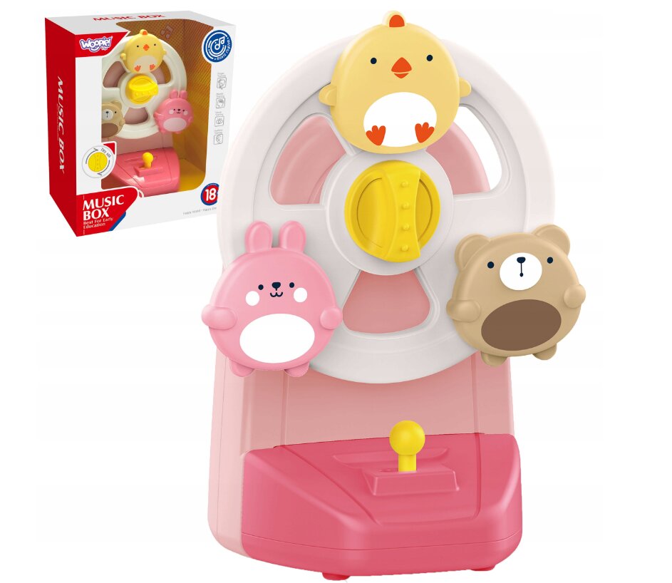 Hudební kolotoč s otáčejícími se zvířaty.Hračka funguje jako hudební skříňka s točícími se zvířátky na kolotoči. Je zaměřena především na rozvoj smyslů a lze ji použít jako dudlík při usínání.Na zadní straně jsou umístěna čísla, která napodobují vytáčení starého klikového telefonu. Výrobek má...
