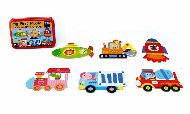 Puzzle drewniane przedstawiające pojazdy z pasażerem- zwierzątkiem. W zestawie jest 6 układanek. Znajdują się w metalowym pudełku. Dzieci w małym wieku zaczynają tworzyć koncepcje wielkości, koloru i przestrzeni obiektów. Prosty trening łamigłówek z tą układanką może nauczyć dzieci logicznego...