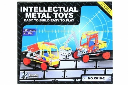Metalowy zestaw konstrukcyjny od EURO-TRADE. Pozwala nam zbudować dwa pojazdy - koparkę i samochód transportowy. Pojazdy będą wyposażone w specjalne gąsienice. Elementy znajdujące się w pudełku są kolorowe. Maszyny będą posiadać podstawowe cechy pojazdów drogowych (np. kierownica, siedzenia). Zestaw łatwy w konstrukcji.Wymiary opakowania: 28x4x24cmWiek: 6+