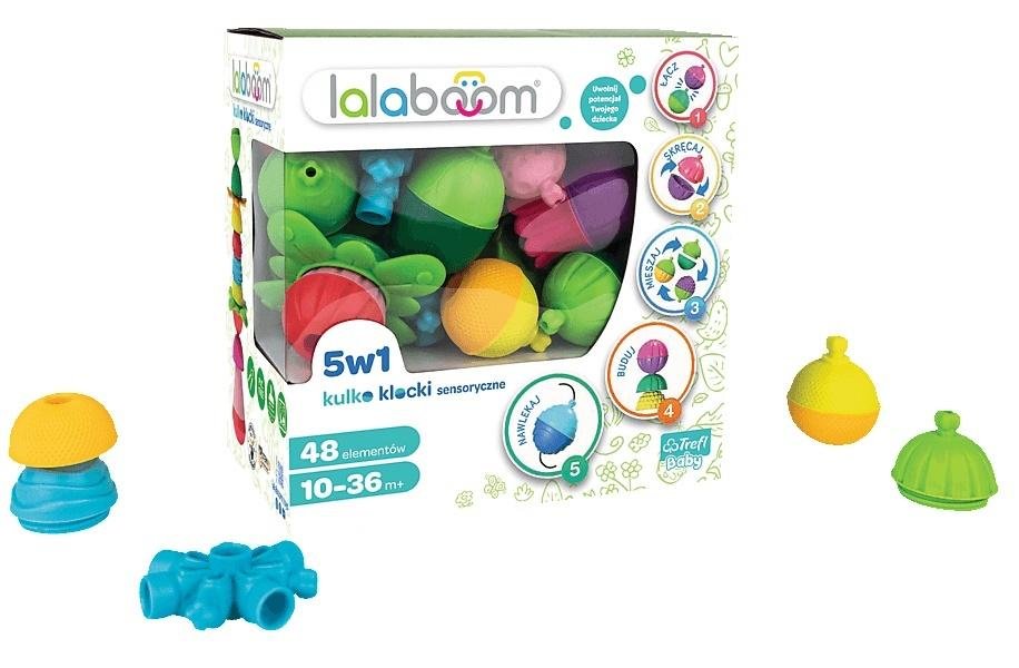 Zestaw kulko - klocków Lalaboom składający się z 48 elementów dostarcza dzieciom wiele zróżnicowanych wrażeń dotykowych ze względu na różne faktury poszczególnych elementów. Zabawka daje możliwość ćwiczenia ruchów obrotowych nadgarstka, a także rozwija chwyt pęsetkowy (przeciwstawienie kciuka palcowi wskazującemu) i precyzyjne ruchy ręki przy nawlekaniu. Zestaw rozwija małą motorykę i koordynację wzrokowo-ruchową oraz wspiera ćwiczenia koordynacji.