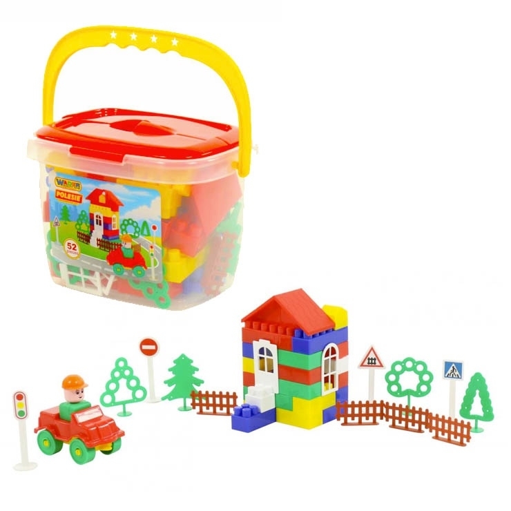 Stavebnice v praktickém kontejneru 52 dílná s rozměrem základního dílu 3 x 3cm. V balení jsou stavební kostky, střecha na domeček a doplňky jako strom a dopravní značky. przeczytaj całość