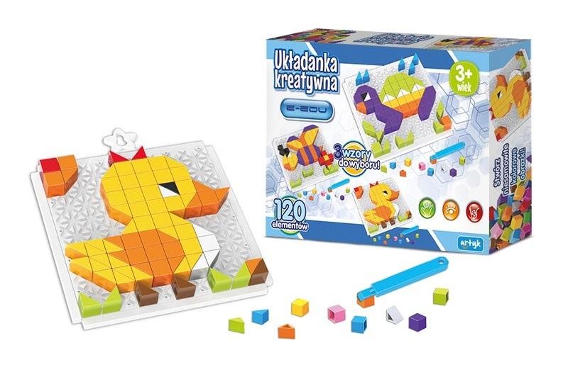 Układanka kreatywna E-Edu 120 elementów.W zestawie:klocki w różnych kształtach i kolorach,1 płytka 11 x 11 cm,4 el. ramki,uchwyt do zawieszania obrazka,nożyk do wyjmowania klocków.Możliwość ułożenia 4 obrazków. przeczytaj całość