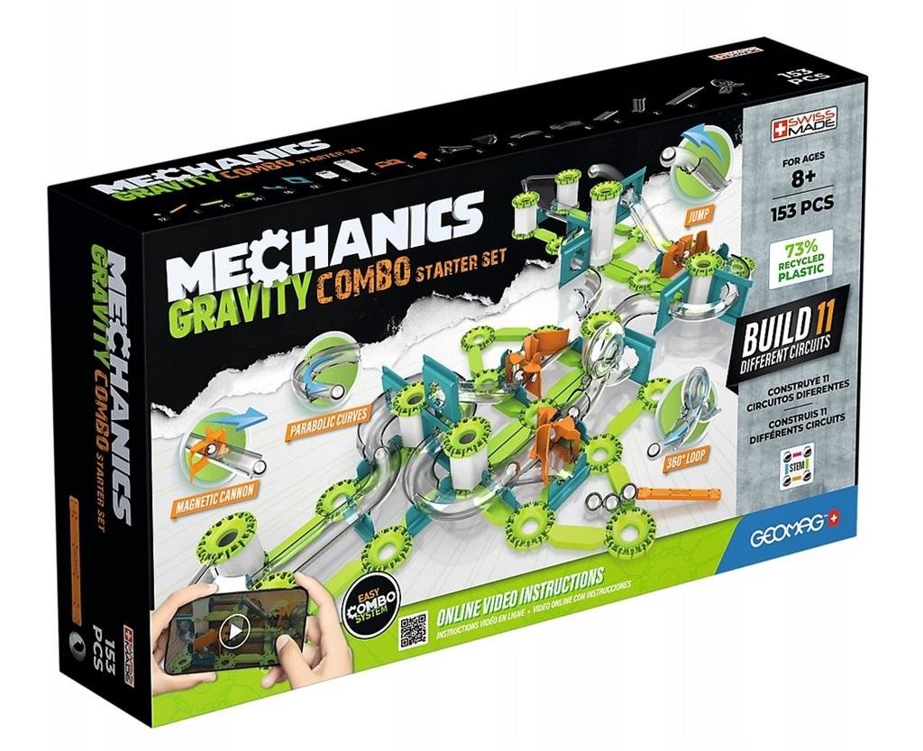 Geomag Mechanics Gravity RE Combo Starter 153 - zbuduj tor wraz z pętlą oraz zakrętami, a następnie połącz siły grawitacji i magnetyczną, aby wywołać ruch! Geomag Mechanics to platforma konstrukcyjna, która łączy siły magnetyzmu ze światem konstrukcji mechanicznych. Stymuluje kreatywność i pomysłowość oraz rozwija wyobraźnię przestrzenną! Do konstrukcji dodane są patyczki magnetyczne i metalowe kulki oraz elementy mechaniczne, które poszrzają możliwości zabawy. Niektóre części konstrukcji mogą się obracać, wywołując reakcje łańcuchowe wynikające z przyciągania i odpychania magnetycznego.