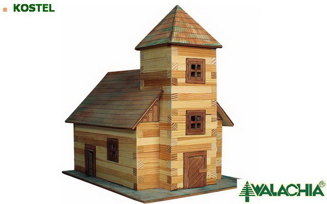 Drewniany model do sklejania Walachia - Kościół. Składanki Walachia to drewniane modele domów i budowli z regionu Valašsko w skali 1:32. Podstawą są drewniane klocki o wymiarach 9 x 9 mm, a w zestawie zawsze znajdują się wszystkie papierowe dodatki - okna, drzwi, części dachowe itp. Do klejenia używa się kleju Herkules, który nie jest jednak częścią zestawu. Dołączona jest instrukcja montażu oraz krótkie rozdziały z historii architektury ludowej. Poniżej oznaczono poziom trudności liczbą 1-5, przy czym 1 jest najłatwiejszy. Wymiary: 23 x 16 x 24 cm Poziom szczegółów (liczba części): 213 Trudność: 5