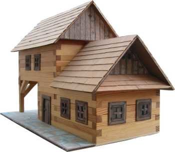 Drewniany zestaw do sklejania Walachia - Karczma. Zestawy do sklejania Walachia to drewniane modele domków i budowli z regionu Valašsko w skali 1:32. Podstawą są drewniane klocki o przekroju 9x9 mm, a w zestawie znajdują się zawsze wszystkie papierowe elementy uzupełniające - okna, drzwi, części dachowe itp. Do klejenia używa się kleju Herkules, który nie jest jednak częścią zestawu. Dołączona jest instrukcja montażu oraz krótkie rozdziały z historii architektury ludowej. Poniżej oznaczenie stopnia trudności liczbą 1-5, gdzie 1 jest najłatwiejsze. Wymiary: 34 x 15 x 23 cm Liczba części: 192 Trudność: 4