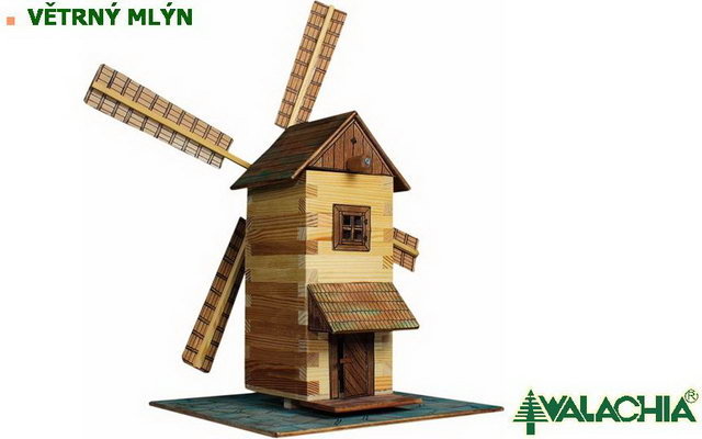 Drewniany zestaw do składania Walachia - Młyn wiatrowy. Zestawy do składania Walachia to drewniane modele domków i budynków z regionu Valašsko w skali 1:32. Podstawą są drewniane belki 9x9 mm, a w zestawie znajdują się zawsze wszystkie papierowe dodatki - okna, drzwi, elementy dachowe itp. Do klejenia stosuje się klej Herkules, który nie jest częścią zestawu. Dołączona jest instrukcja montażu oraz krótkie rozdziały z historii architektury ludowej. Poniżej oznaczenie stopnia trudności liczbą 1-5, gdzie 1 jest najłatwiejszy. Wymiary: 14 x 10 x 32 cm Liczba elementów zestawu: 137 Trudność: 3
