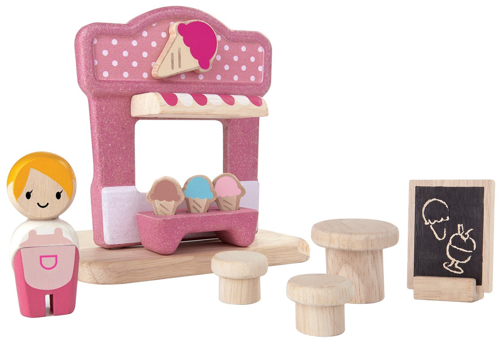 Malý stánek se zmrzlinou z kaučukového dřeva se skládá z jednotlivých dílků, které lze několika jednoduchými kroky sestavit dohromady. Přední část zobrazuje stavbu, zadní dílky pak představují vnitřek budovy.